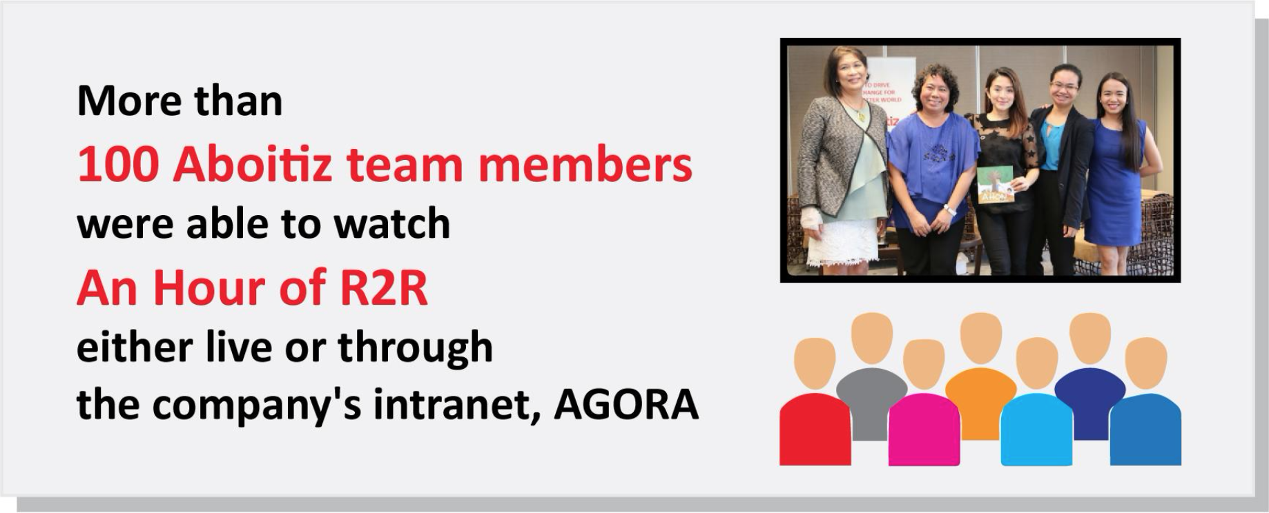 The talk, which borrowed its name from the Aboitiz Group’s Race to Reduce (R2R) resource efficiency campaign, went live on the organization intranet and was viewed by Aboitiz team members all over the country.