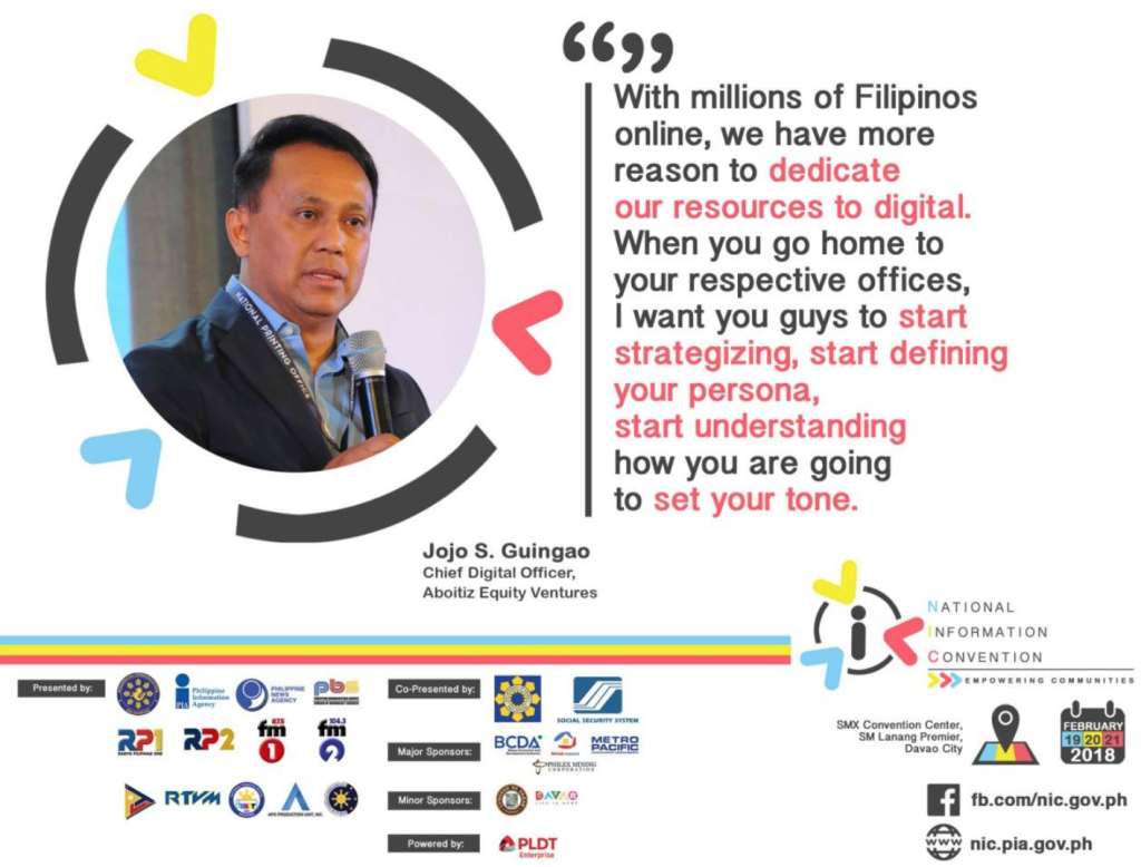 Aboitiz Equity Ventures’ Chief Digital Officer Jojo Guingao recently shared how to utilize Digital Media for Social Mobilization in the first National Information Convention, organized by the Philippine Information Agency.