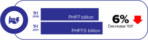 Aboitiz Power Corporation’s net income contribution to AEV during the first half of 2018 decreased by 6% YoY, from PHP7.5 billion to PHP7 billion. At 100%, AboitizPower’s net income amounted to PHP9.1 billion, also 6% lower YoY.