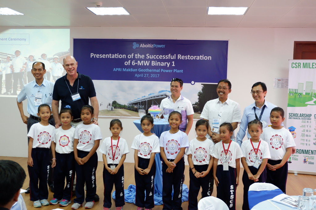 AboitizPower President and COO Antonio Moraza (first row, second from left) and AP Renewables President and COO Felino Bernardo (first row, rightmost) join children from Sto. Tomas South Central School for a photo op during the presentation of the restoration of the Binary 1 Plant.