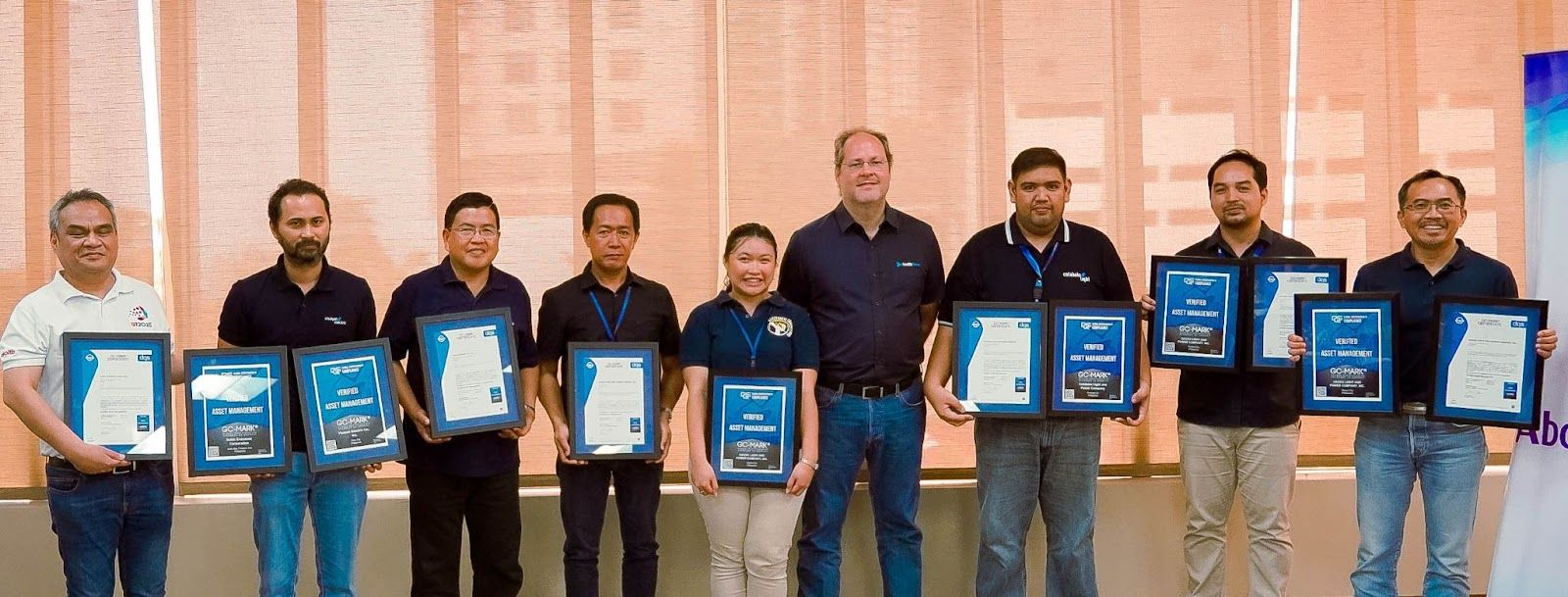 Representatives from the four AboitizPower DUs, led by DU Chief Operating Officer Anton Perdices (fourth from right), receive the ISO 55001:2014 certification for Asset Management during an event in Cebu.