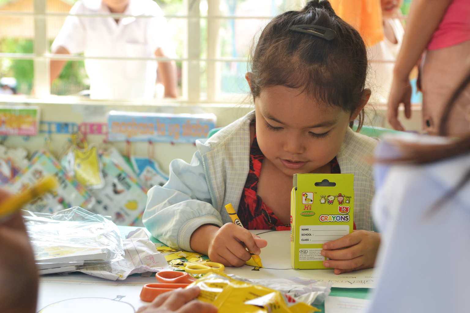 Each kit contained pencils, notebooks, writing pads, sharpener, eraser, and crayons.