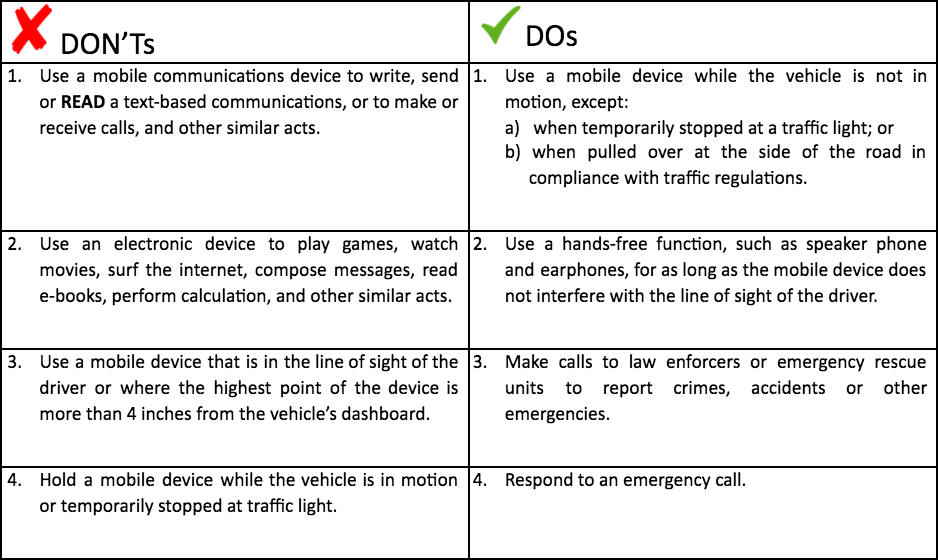In the interest of preserving the sanctity of our driver’s licenses (and payroll accounts) AEV LMS has set out below a list of do’s and don’ts under the Anti-Distracted Driving Act. These apply to all person driving or operating on public thoroughfares or streets, whether the vehicle is in motion or temporarily stopped at a traffic light, and whether using sedans, SUVs, tractors, graders, bulldozers, BICYCLES, pedicabs, habal-habal, chariots, sledges and other forms of conveyances: