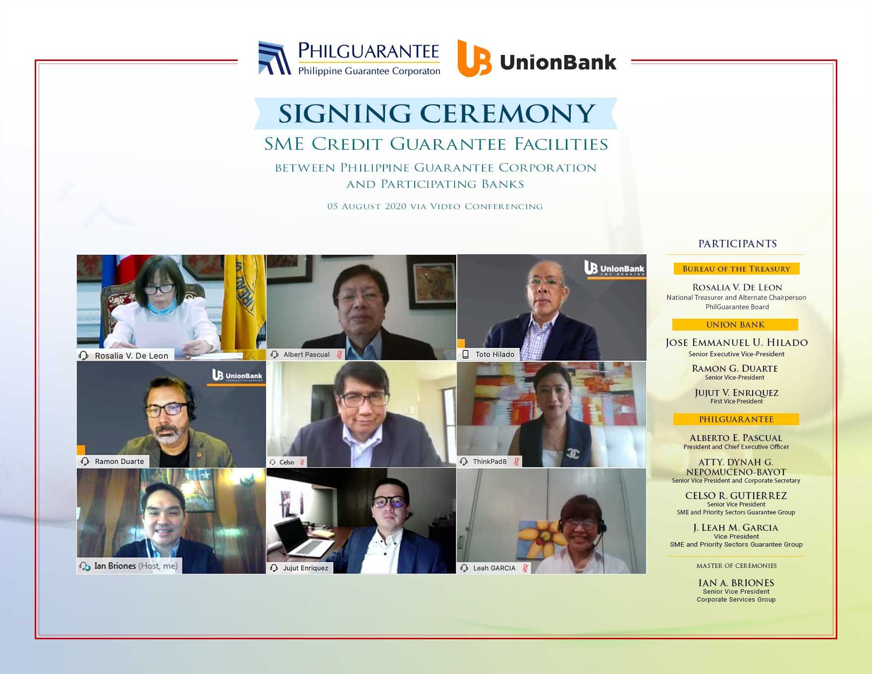 A virtual signing ceremony was held last Aug. 5, attended by UnionBank key officers namely chief finance officer and treasurer Jose Emmanuel Hilado, Transaction Banking Center Head Ramon Duarte, and SME business group head Jujut Enriquez, as well as PHILGUARANTEE officials led by president and CEO Alberto Pascual, and national treasurer and PHILGUARANTEE board alternate chairperson Rosalia De Leon.