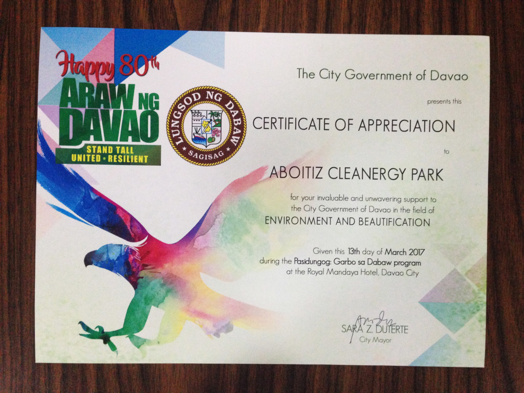The Davao City government on March 13 recognized the Aboitiz Cleanergy Park for its for its invaluable and unwavering support in the field of Environment & Beautification.