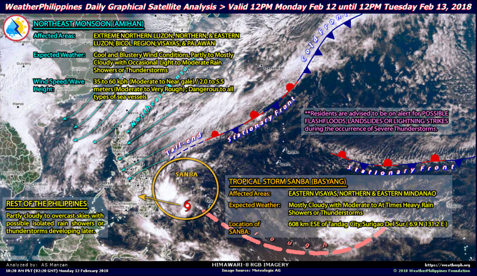 The burning question remains: How low will the temperature will ever get on Valentines’ Day? Will it break the record of last year’s 10.1C? This one will be closely monitored as the surge of the Northeast Monsoon (AMIHAN) continues coupled with the passage of Tropical Storm SANBA (BASYANG) over Northern Mindanao, Visayas and Palawan.