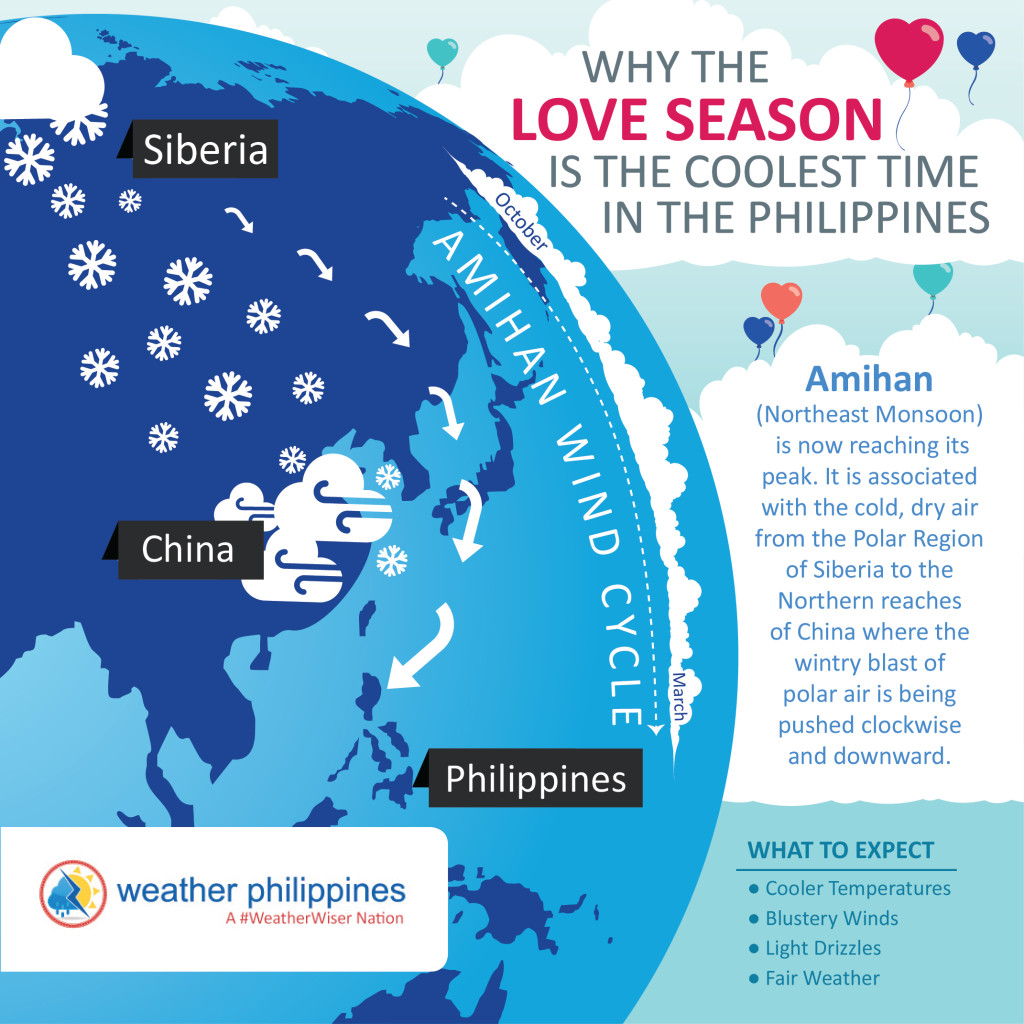 Based on historical climate data (1900 through 2012), the months of January to February are among the coldest months in the Philippines. It is during this time when the Northeast Monsoon, locally known as Amihan is nearing its peak. It is associated with the cool, dry air blowing from the Polar region of Siberia, Mongolia, and the Northern reaches of the Chinese mainland where wintry blast of polar air is consequentially being pushed clockwise and downward by a strong anti-cyclone (High Pressure) system.
