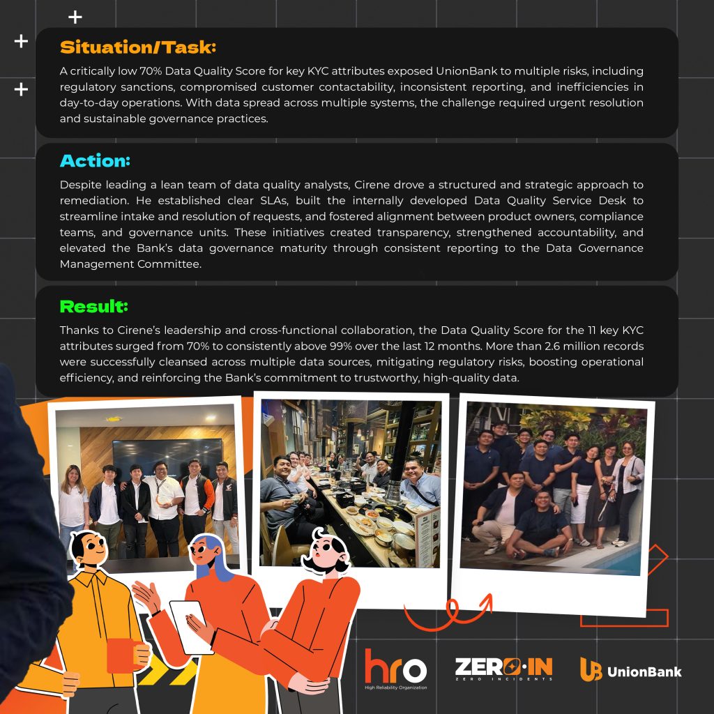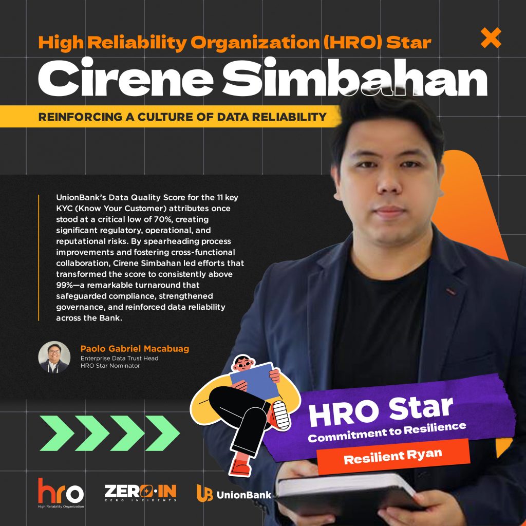 Cirene’s leadership and cross-functional collaboration led to a dramatic turnaround: the Data Quality Score surged from 70% to consistently above 99% over the past 12 months. Over 2.6 million records were successfully cleansed across multiple data sources, significantly reducing regulatory exposure, improving operational efficiency, and reinforcing UnionBank’s commitment to trustworthy, high-quality data. This achievement reflects the Bank’s techglomerate mindset—leveraging technology and collaboration to drive innovation, safeguard compliance, and deliver superior customer experiences.