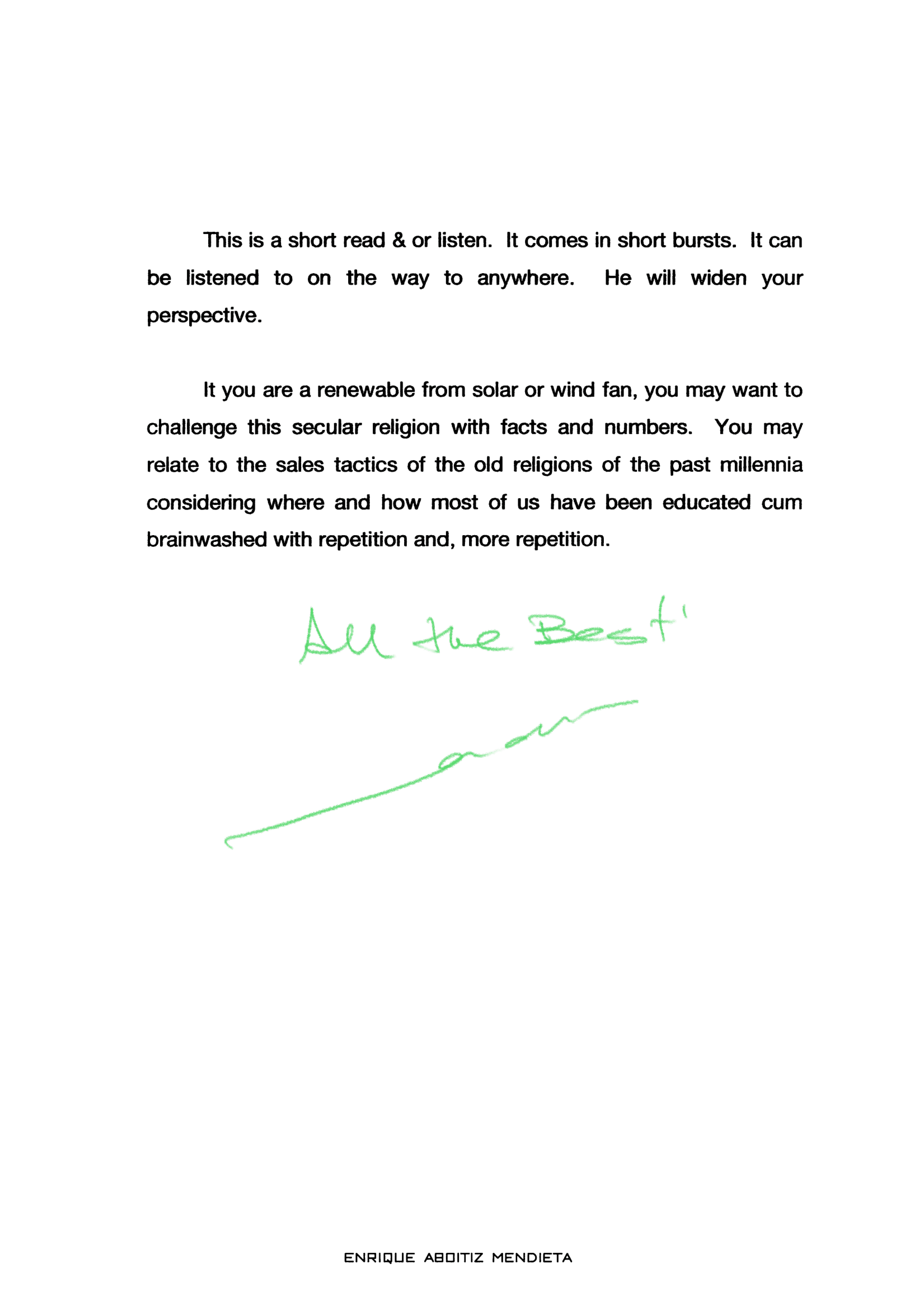 If you are a renewable from solar or wind fan, you may want to challenge this secular religion with facts and numbers. You may relate to the sales tactics of the old religions of the past millennia considering where and how most of us have been educated cum brainwashed with repetition, and more repetition.