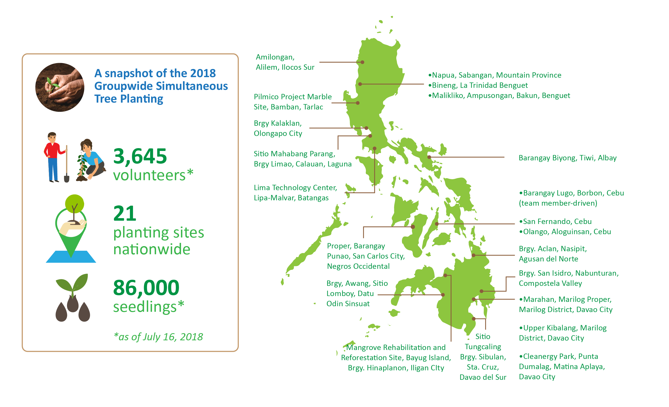 On July 14, 2018, more than 3,600 volunteers gathered for the annual Aboitiz Groupwide Simultaneous Tree Planting. In high spirits for the yearly event, team members planted about 86,000 seedlings across 21 planting sites all over the Philippines, with plans to plant more trees in the coming months as part of our A-Park program.