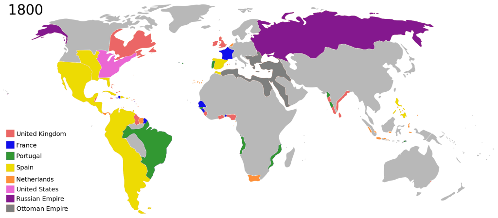 A color-coded map of the world indicating the colonies of European powers during the 1800s.