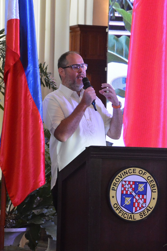 AboitizPower Distribution Utilities Chief Operating Officer Anton Mari Perdices delivers a speech in response to the plaque of appreciation he received on behalf of the Visayan Electric team from the Cebu Provincial Government at the Capitol Social Hall on Feb. 7, 2022. (Photo by Capitol PIO)