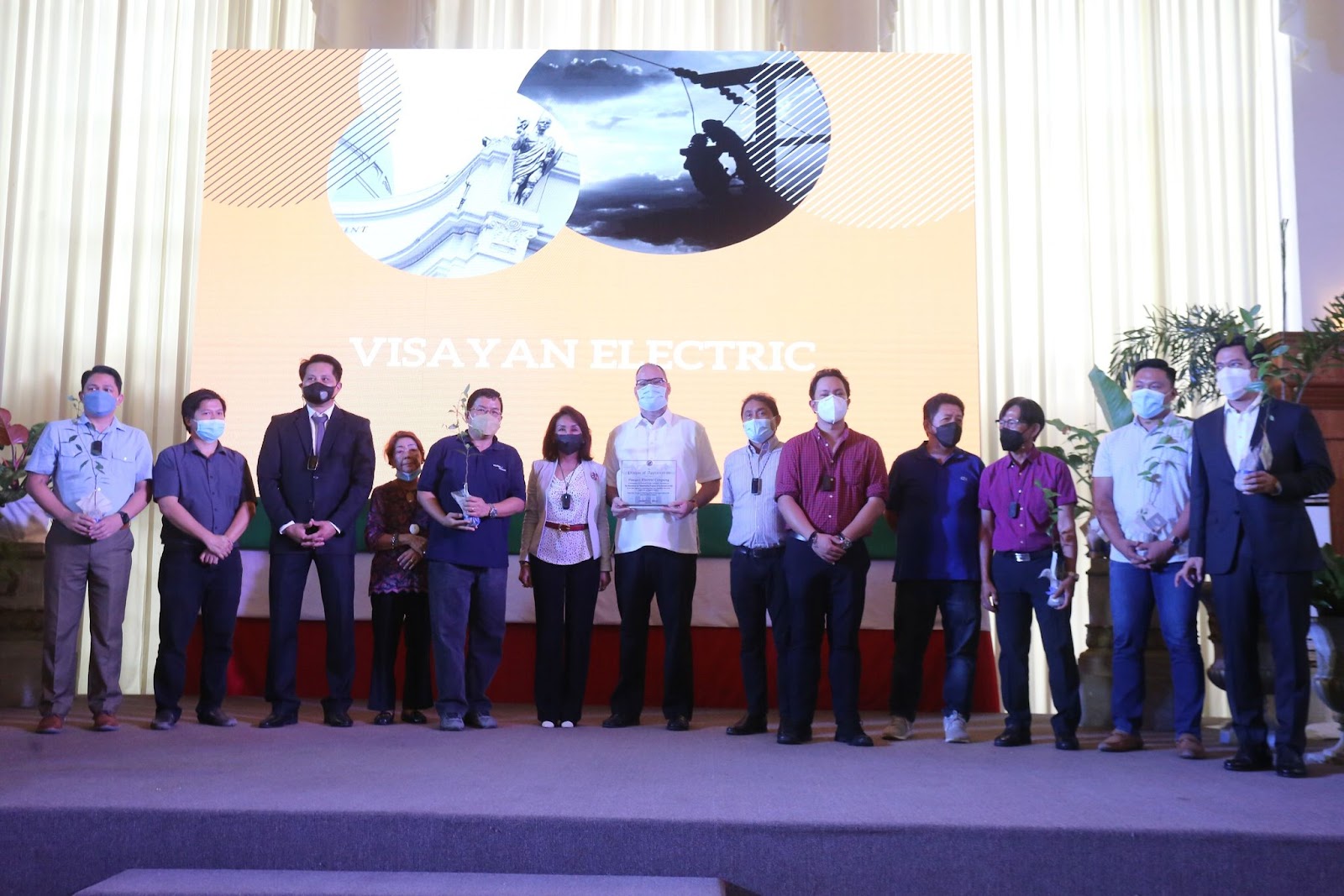THANK YOU. Visayan Electric President and Chief Operating Officer Raul Lucero (5th from left) and AboitizPower Distribution Utilities Chief Operating Officer Anton Mari Perdices (7th from left) receive a plaque of appreciation and Cebu cinnamon tree sapling from Gov. Gwendolyn Garcia (6th from left) during the Cebu Provincial Government’s Appreciation Ceremony for those who helped in the province’s recovery efforts from typhoon Odette at the Capitol Social Hall on Monday, Feb. 7, 2022. Joining them are members of the Cebu Provincial Board. (Photo by Capitol PIO)