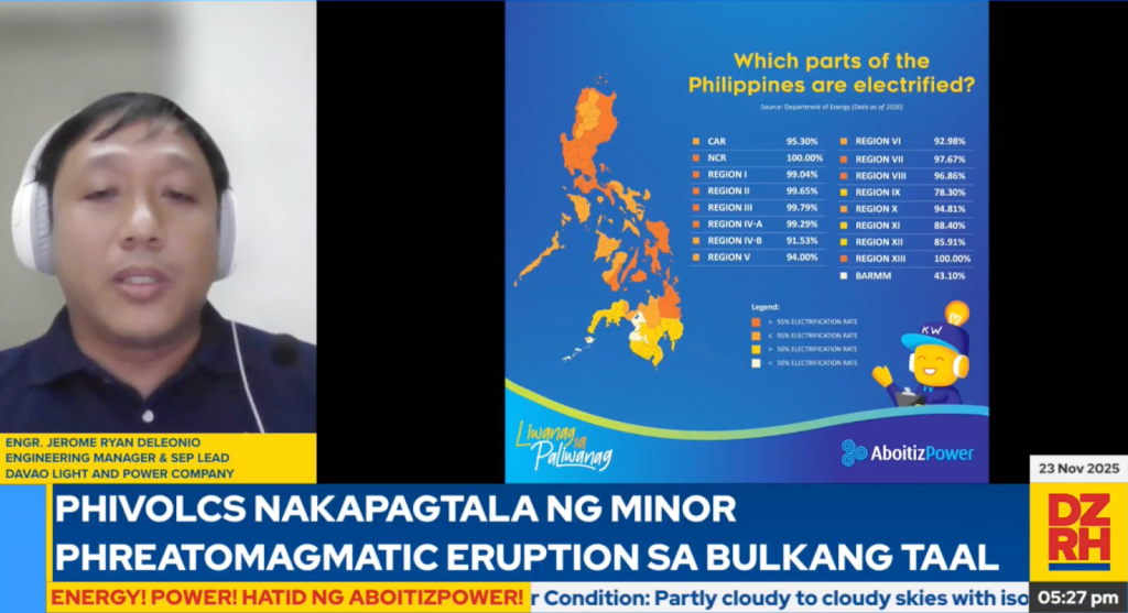 DOE Undersecretary Mario Marasigan and Engr. Jerome Ryan Deleonio, Engineering Manager and Sitio Electrification Program Lead of Davao Light and Power Company, discussed the Sitio Electrification Program, which seeks to electrify remote, far-flung towns and transform the lives of families through opportunities and livelihoods borne of energy access. The episode highlighted Davao Light’s efforts to bring safe and reliable electricity to underserved communities within its franchise area.
