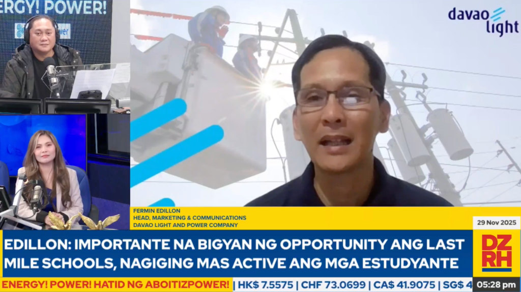 Department of Education Undersecretary Malcolm Garma and Fermin Edillon, Marketing and Communications Head of Davao Light and Power Company, discussed the electrification of communities and schools in last-mile areas in Davao. Through AuroraPH, an initiative of the Aboitiz Foundation, in partnership with Davao Light within its franchise area, schools in Sitio Kabangbang in the Marilog District of Davao City were finally provided with electricity via solar panels, powering classrooms and providing internet connectivity, and thereby giving students better access to education.