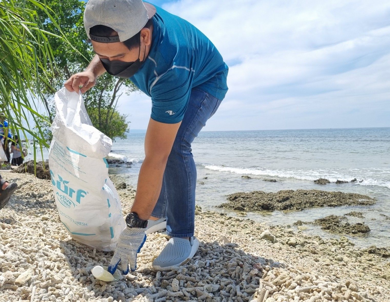 A member of Ecoteneo-Junior High School picks up a plastic bottle on the shores of Aboitiz Cleanergy Park.