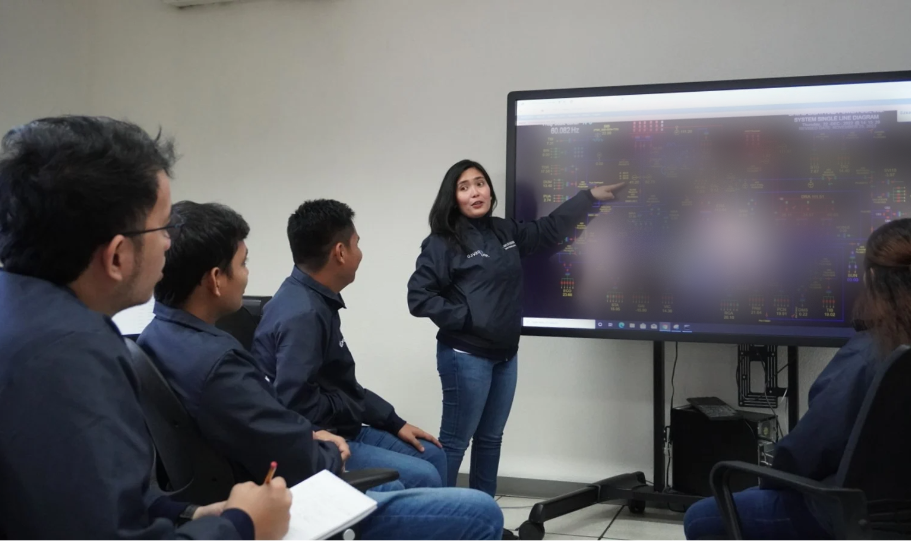 A widescreen occupying half of the room, called the Graphic User Interface (GUI), shows the real-time data across the different substations and line device equipment in the franchise areas of Davao Light and Power Co. Inc., an AboitizPower subsidiary.