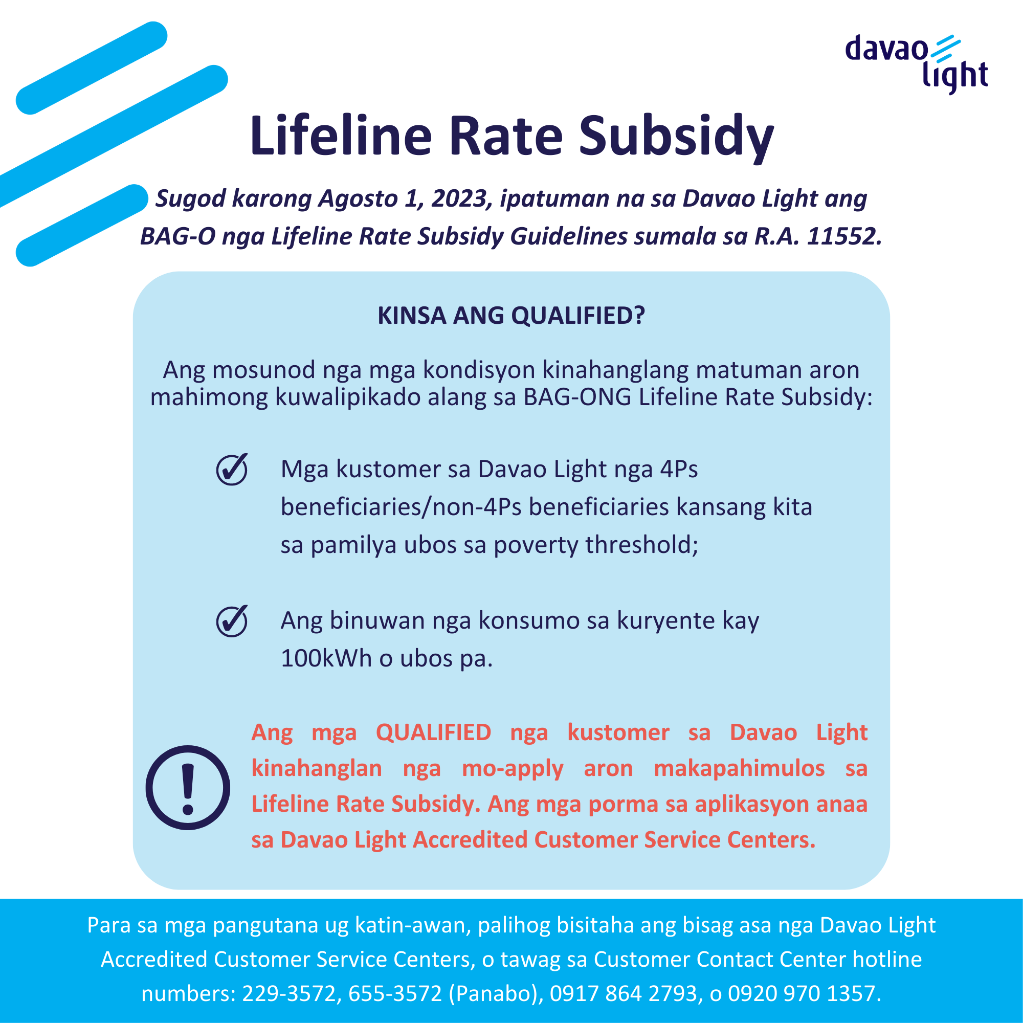 For more information, inquiries, or concerns, customers can contact Davao Light through its 24/7 Customer Contact Service at 229-3572, 655-3572 (Panabo), 0917-864-2793, or 0920-970-1357, or through its official Facebook page. For queries relating to the implementation of RA 11552 and its Implementing Rules and Regulations, kindly contact Energy Regulatory Commission’s (ERC) Lifeline Program hotline numbers: (02) 8689 5372 loc 5222 (Pasig City), (63) 905 343 2292 (Cebu City) or (63) 956 305 3313 (Davao City).