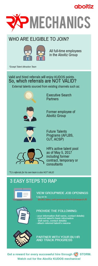 As our businesses advance locally and offshore, our requirements for A-talents increase with it.“We will continue to expand and enrich our hiring channels but study after study confirm Employee Referrals is the best way to find talents that fit. A re-energized group-wide Refer an A-Person Program (RAP) will not only assist our efforts towards effective hiring, it will greatly encourage employee involvement and give us a way to thank them for it,” said Nina Pedro, AGHR.