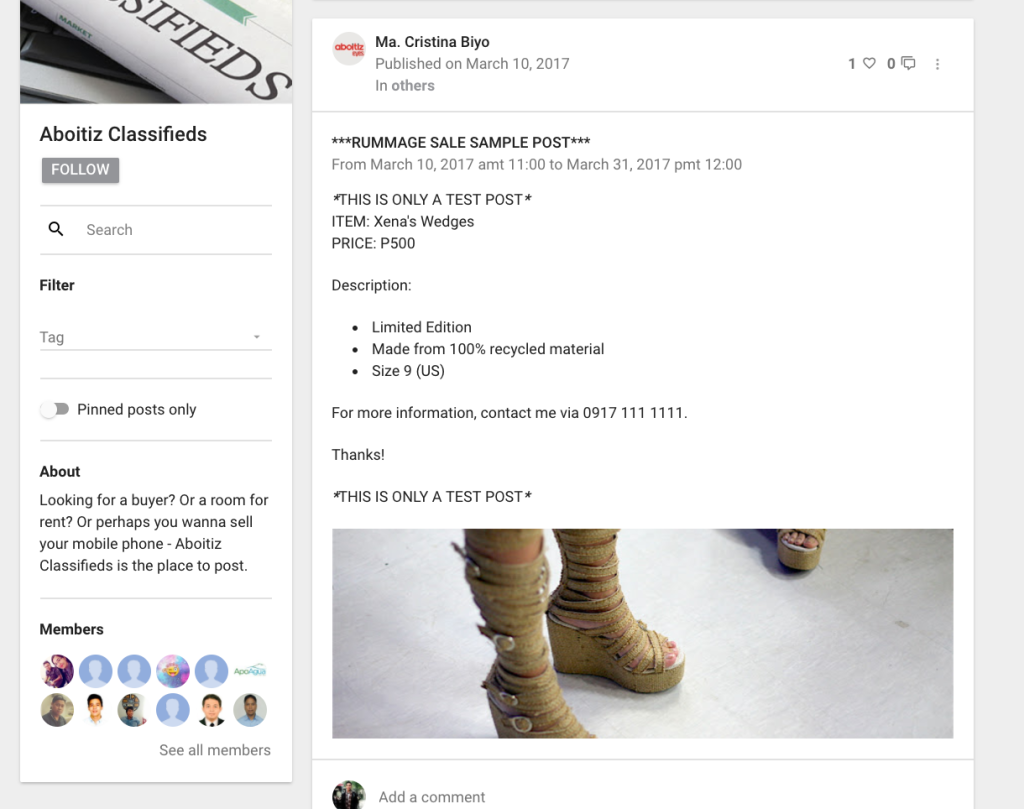 3. To sell on AEV’s AGORA, go to the Aboitiz Classifieds section (under Communities) and “Add a post” for items you are selling. Under “Select a category,” choose “rummage sale.” TIP: Make one post per item. See sample below.