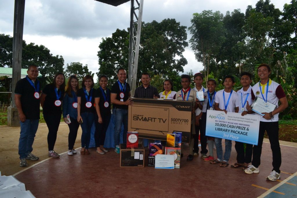 Three schools emerged to the top after the Final Judging and Awarding Ceremony last Dec. 13, 2016 at the Activity Center of Abreeza Mall. These were Sto. Niño National High School in first place, Bernardo D. Carpio National High School from Buhangin District in second place, and Maria Cristina P. Belcar Agricultural High School from Baguio District in third place. Aside from plaques, medals and certificates, these schools received the following cash and item prizes: P25,000 cash for the team and P150,000 worth of computer package for the winning school, P15,000 cash and P80,000 worth of science instruments package for the second placer, and P10,000 cash and P50,000 worth of library package for the third placer.