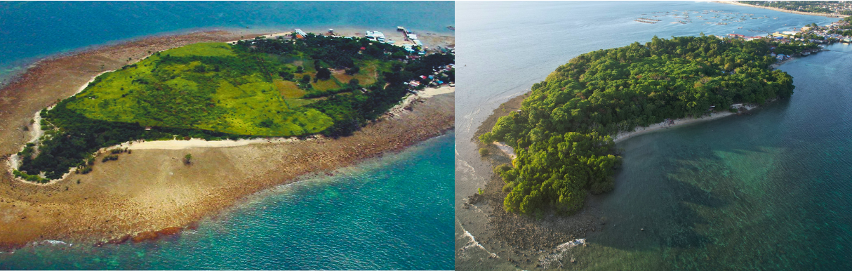 Before and after. From a sandbar and grassland in 2009 (left), a coast in Punta Dumalag, Davao City, managed by the Aboitiz Cleanergy Park, is now dense with mangroves and trees (right). This is in part due to the collective efforts of volunteers in sustaining the Park’s mangrove reforestation site.