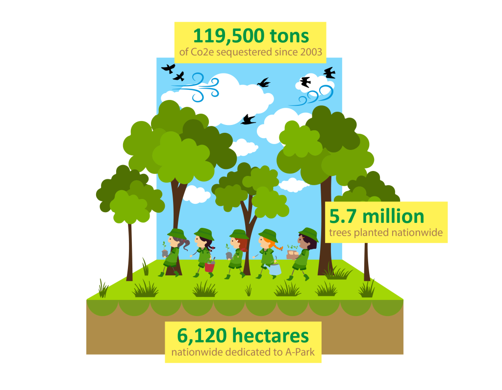 Since it began in 2003, A-Park has sequestered 119,500 tons of carbon dioxide equivalent, greatly surpassing our 52,000 tons CO2e business consumption as of year-end 2017. And thanks to our partners and stewards in many parts of the country who care for our trees, the seedlings that we once planted can continue to grow for many more years.